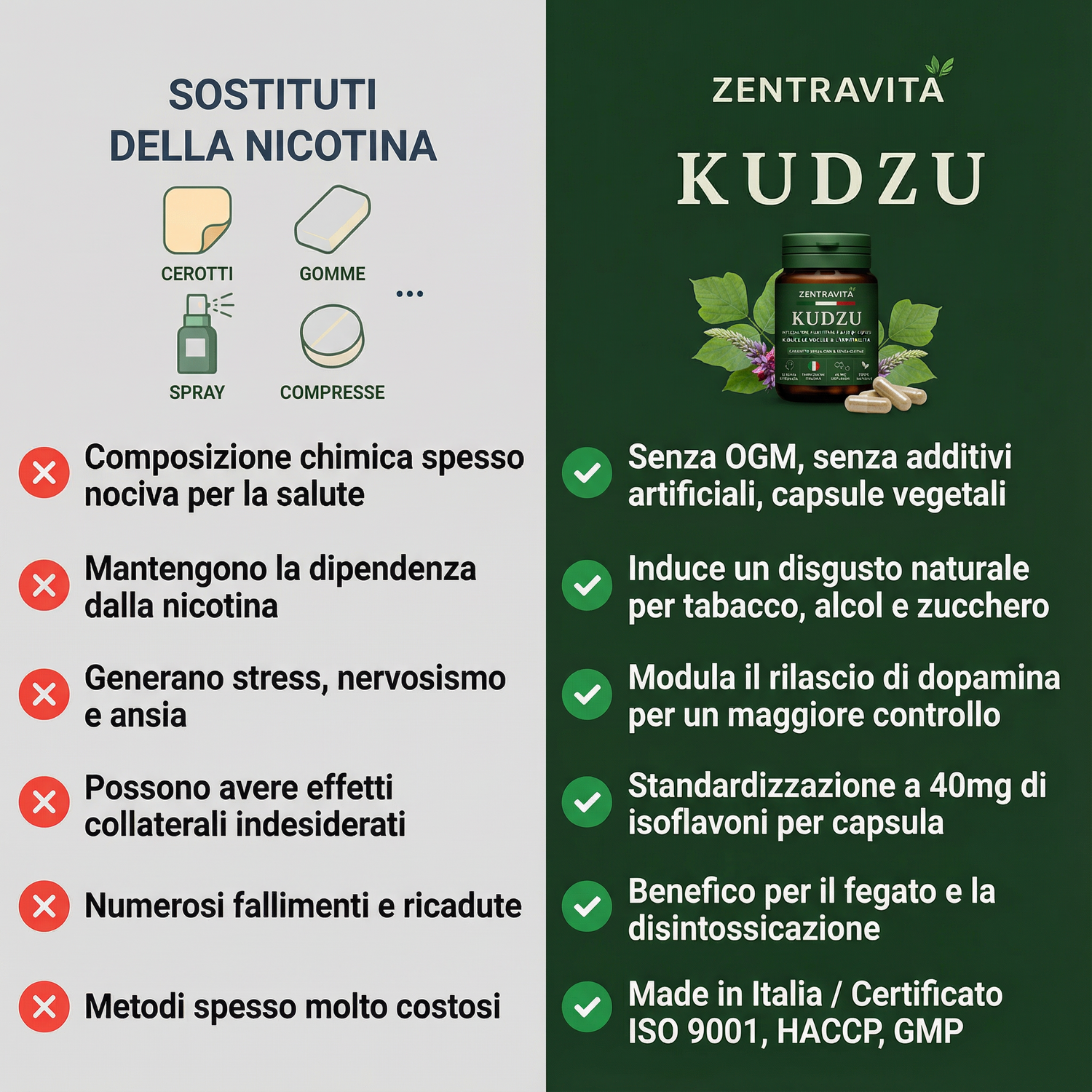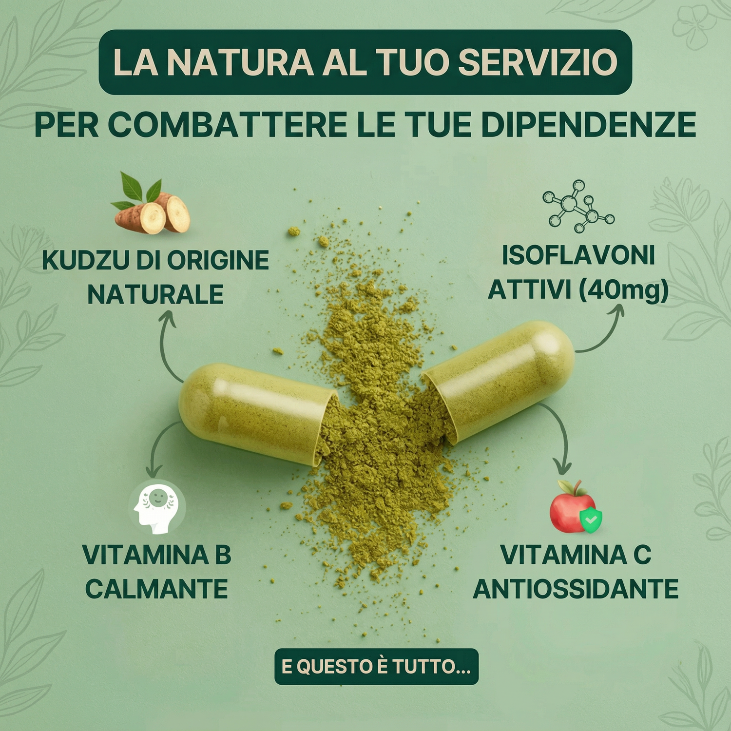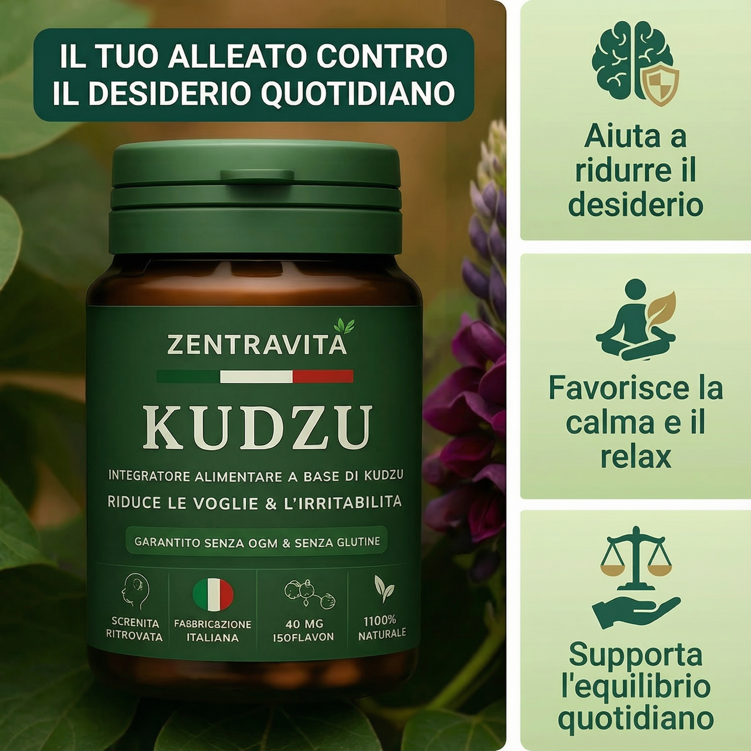 Solo kudzu concentrato, titolato al 40% di isoflavoni. Un effetto calmante duraturo, senza effetti collaterali né dipendenza. .